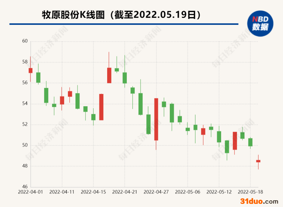 5月19日,牧原股份股价下跌,截至收盘报48.58元,跌2.72%,总市值2585亿元。