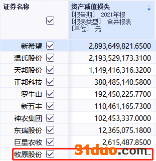 据中国基金报,申万三级行业下生猪养殖公司共有10家,除牧原股份外,其余9家2021年度均发生不同程度的资产减值损失。体量大的如新希望减值损失达到29亿元,温氏股份也达到22亿元,体量小的巨星农牧最少也有260多万,而作为行业出栏量第一的牧原股份居然没有任何减值损失,确实非常扎眼。