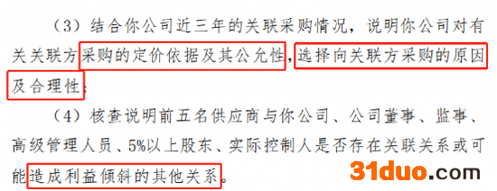 深交所还要公司结合近三年的关联采购情况,说明对有关关联方采购的定价依据及其公允性,选择向关联方采购的原因及合理性。最后要求其核查说明前五名供应商与公司、公司董事、监事、高级管理人员、5%以上股东、实际控制人是否存在关联关系或可能造成利益倾斜的其他关系。