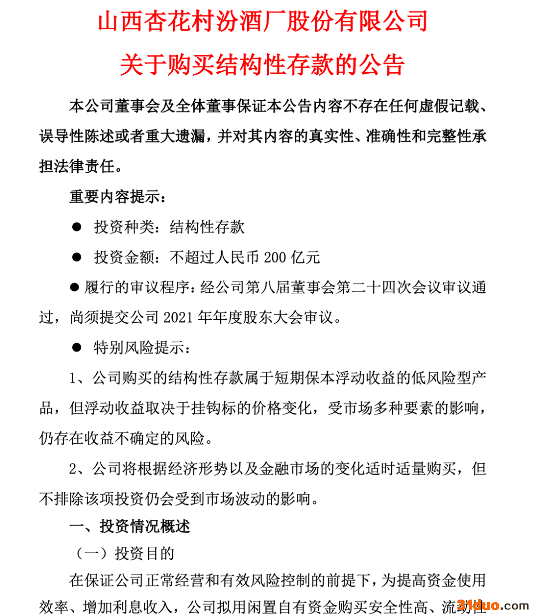 不过,山西汾酒也在公告中提醒,公司购买的结构性存款属于短期保本浮动收益的低风险型产品,但浮动收益取决于挂钩标的价格变化,受市场多种要素的影响,仍存在收益不确定的风险。
