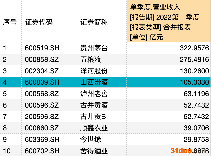 值得一提的是,在2022年一季度白酒上市公司营收排行中,山西汾酒超过了泸州老窖,排在行业第四位。