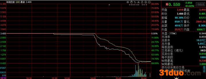 5月19日,港股又一房企闪崩,午盘后下午3点30分左右,领地控股一度跌超88%,盘中低见0.55港元,创历史新低,领悦服务集团跌近40%,亦创上市新低。截至收盘,领地控股下跌幅度高达83.82%,股价不足1港元,市值只剩5.65亿港元。