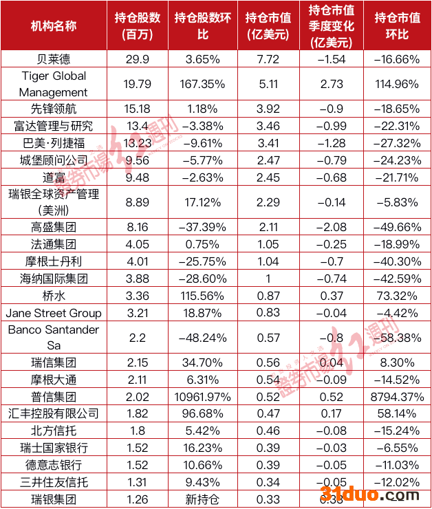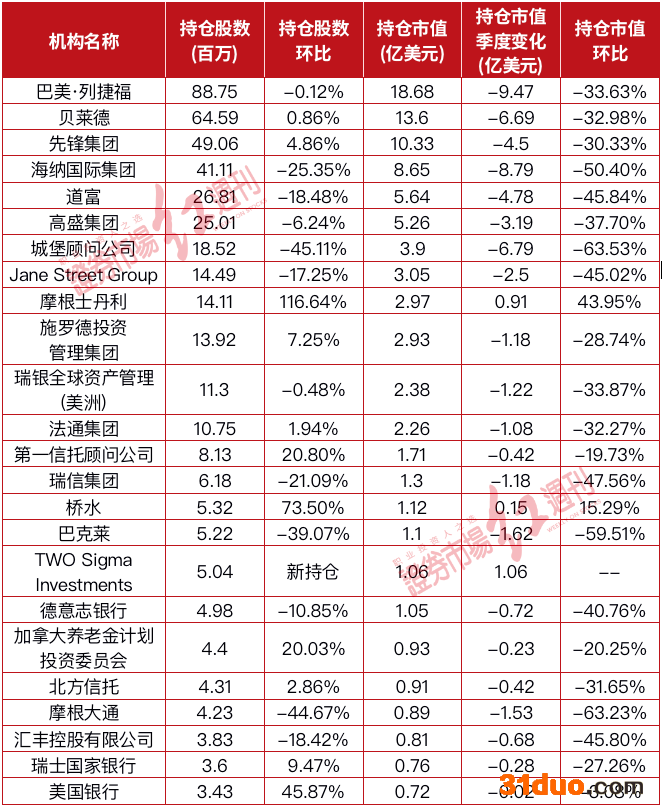 与增仓相对,499家持仓机构中,有83家进行了减仓。如持仓市值过亿美元的机构中,海纳国际集团减仓25.35%;道富减仓18.48%;城堡顾问公司减仓45.11%;瑞信集团减仓21.09%等(见表1)。