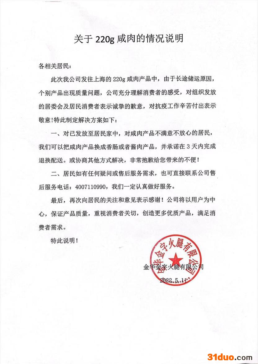 一份来自金华金字火腿(002515)有限公司(以下简称为“金华金字”)“关于220g咸肉的情况说明”显示,此次公司发往上海的220g咸肉产品中,由于长途储运原因,个别产品出现质量问题,公司对此表示歉意,并给出两种解决方案: