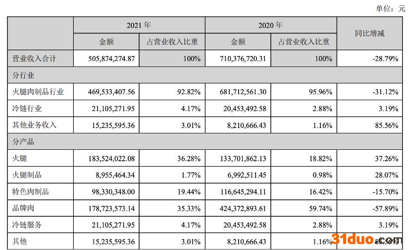 业绩方面,2021年,金字火腿全年实现营业收入5.06亿元,同比减少28.79%;实现净利润4285.39万元,同比减少27.74%。分产品看,品牌肉业务营业收入从2020年的4.24亿元下滑至2021年的1.79亿元,降幅最为明显。