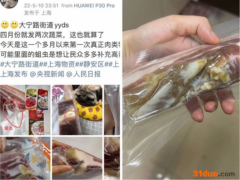 近日,部分上海网友爆料,疑似上海静安区、宝山区组织采购的金字咸肉出现发霉、长蛆等质量问题。