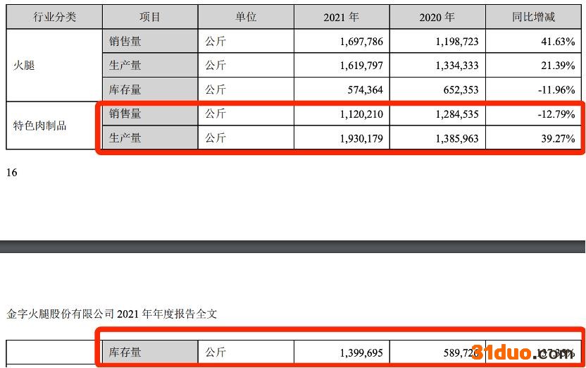 尽管如此,金字火腿仍加大了对特色肉制品的生产,2021年生产量同比增加近40%达到193.02万公斤,产大于销,这也导致库存激增。不过,金字火腿方面否认该批供沪咸肉质量问题由于库存太久所导致,称“并非库存货、产品都是近两个礼拜才成装的”。