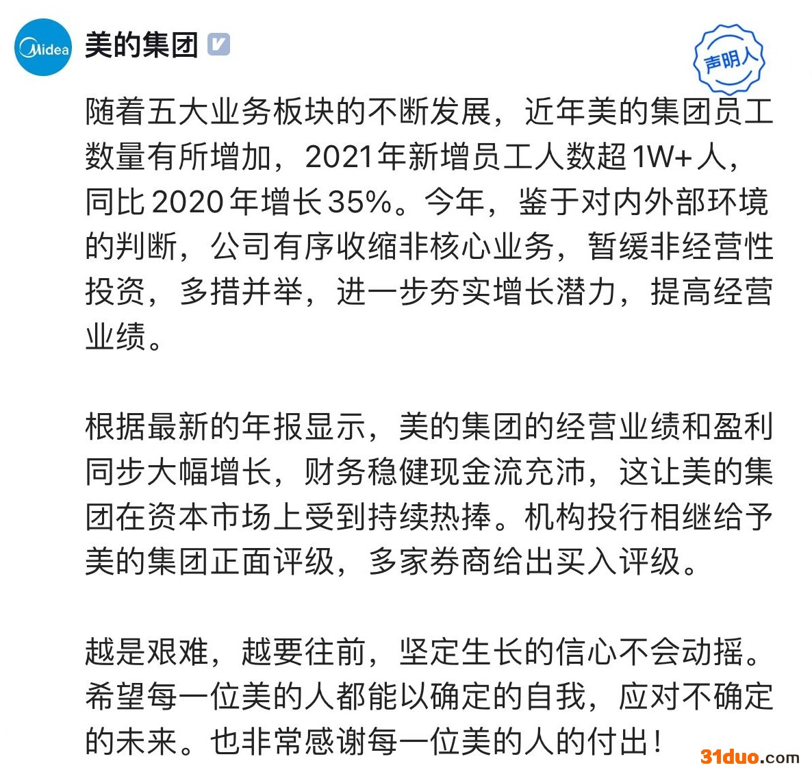中新经纬5月19日电 美的集团19日在脉脉平台回应“裁员50%”消息称,今年,鉴于对内外部环境的判断,公司有序收缩非核心业务,暂缓非经营性投资。
