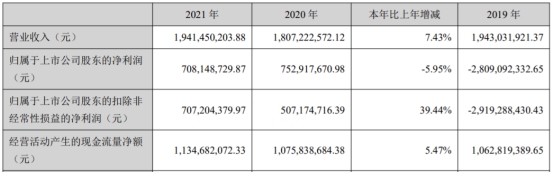 2021年,汤姆猫实现营业收入19.41亿元,同比增长7.43%;归属于上市公司股东的净利润7.08亿元,同比减少5.95%;归属于上市公司股东的扣除非经常性损益的净利润7.07亿元,同比增长39.44%;经营活动产生的现金流量净额11.35亿元,同比增长5.47%。