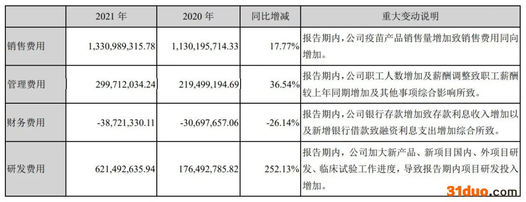盈利能力方面,沃森生物2021年大幅下滑,加权净资产收益率和销售净利率均下跌,2021年分别是5.82%、17.37%,2020年分别是18.12%、41.21%;毛利率同比增长2.56%至88.61%。造成净利率下滑最主要的原因是三项费用的增长:2021年沃森生物销售费用、管理费用和研发费用分别同比增长17.77%、36.54%和252.13%。