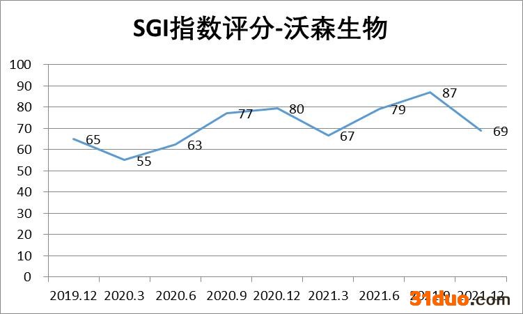 近日,最新和讯SGI指数评分解读出炉,沃森生物(300142)获得了69分,较此前一个季度略有下滑,从此前来看,沃森生物评分表现不稳定,目前又出现下滑状态。