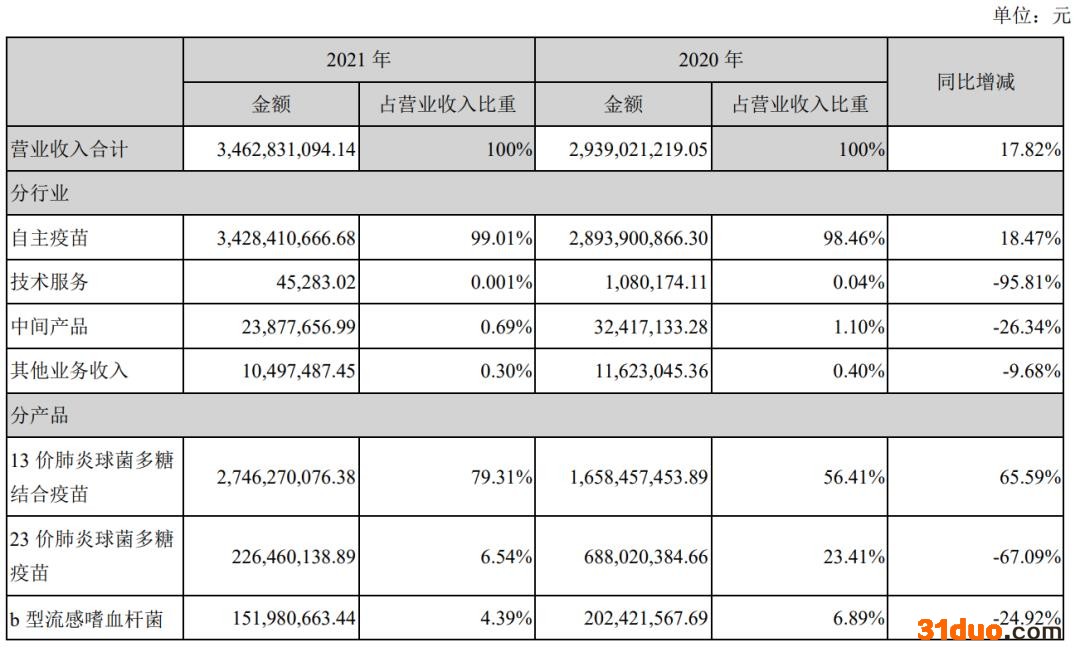 根据年报,2021年沃森生物99%的营收来自于自主疫苗;从产品来看,13价肺炎结合疫苗收入同比增长65.59%至27.46亿元,占营业收入的79.31%,23价肺炎疫苗收入同比下滑67.09%至2.26亿元,占营业收入的6.54%。
