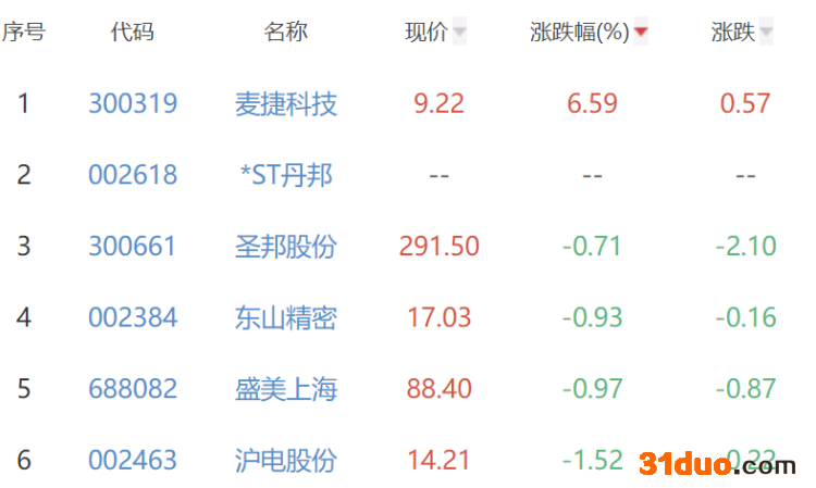 其中,麦捷科技、圣邦股份、东山精密、盛美上海和沪电股份位列板块涨幅榜前五位,涨幅分别为6.59%、-0.71%、-0.93%、-0.97%和-1.52%。