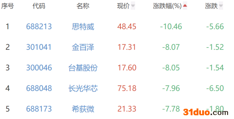 思特威、金百泽、台基股份、长光华芯和希荻微位列板块涨幅榜后五位,涨幅分别为-10.46%、-8.07%、-8.05%、-7.96%和-7.78%。