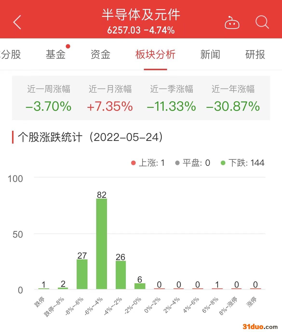 中国经济网北京5月24日讯 今日,半导体及元件板块整体跌幅4.74%,其中1只股票上涨,0只股票平盘,144只股票下跌。