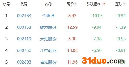 怡亚通、建发股份、天虹股份、江中药业、吉宏股份位列涨幅榜后五位,涨幅分别为-10.03%、-9.94%、-7.38%、-6.50%、-6.34%。