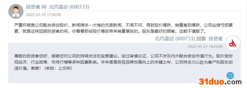 北汽蓝谷5月23日在投资者互动平台回应称,经过审慎论证,公司不涉及内外配合做空市值行为。股价受宏观经济、行业政策、市场行情等多种因素影响。本年度是极狐品牌发展向上的关键之年,公司将全力以赴为客户和股东创造价值。