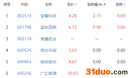 其中,宝馨科技、蓝科高新、菲达环保、哈投股份、广汇能源位列板块涨幅前五位,涨幅分别为2.15%、0.90%、0.00%、0.00%、-1.47%。
