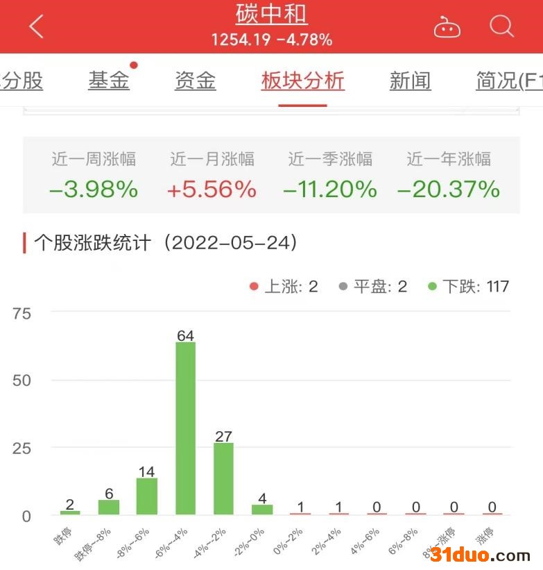 中国经济网北京5月24日讯 今日,碳中和板块整体跌幅4.78%,其中2只股票上涨,2只股票平盘,117只股票下跌。