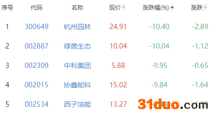 杭州园林、绿茵生态、中利集团、协鑫能科、西子洁能位列涨幅榜后五位,涨幅分别为-10.40%、-10.04%、-9.95%、-9.84%和-9.48%。
