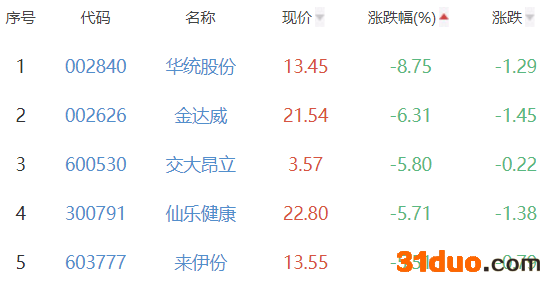 华统股份、金达威、交大昂立、仙乐健康、来伊份位列涨幅榜后五位,涨幅分别为-8.75%、-6.31%、-5.80%、-5.71%、-5.51%。
