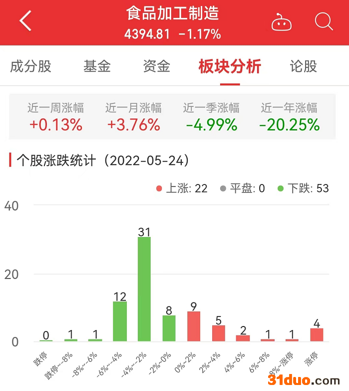 中国经济网北京5月24日讯 今日,食品加工制造板块整体跌幅1.17%,其中,22只股票上涨,53只股票下跌。