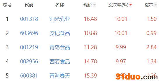 其中,阳光乳业、安记食品、青岛食品、西麦食品、青海春天位列板块涨幅前五位,涨幅分别为10.01%、10.01%、9.99%、9.97%、8.92%。