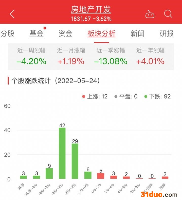 中国经济网北京5月24日讯 今日,房地产开发板块整体跌幅3.62%,其中12只股票上涨,92只股票下跌。