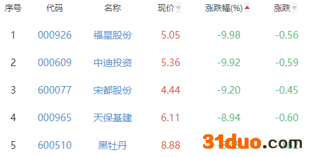 福星股份、中迪投资、宋都股份、天保基建、黑牡丹位列涨幅榜后五位,涨幅分别为-9.98%、-9.92%、-9.20%、-8.94%和-8.45%。