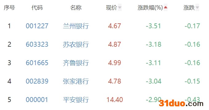 兰州银行、苏农银行、齐鲁银行、张家港行、平安银行位列板块涨幅榜后五位,涨幅分别为-3.51%、-3.18%、-3.11%、-3.04%、-2.90%。