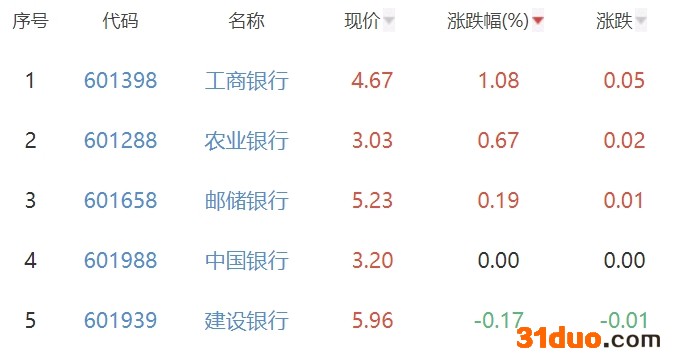 其中,工商银行、农业银行、邮储银行、中国银行、建设银行位列板块涨幅榜前五位,涨幅分别为1.08%、0.67%、0.19%、0.00%、-0.17%。