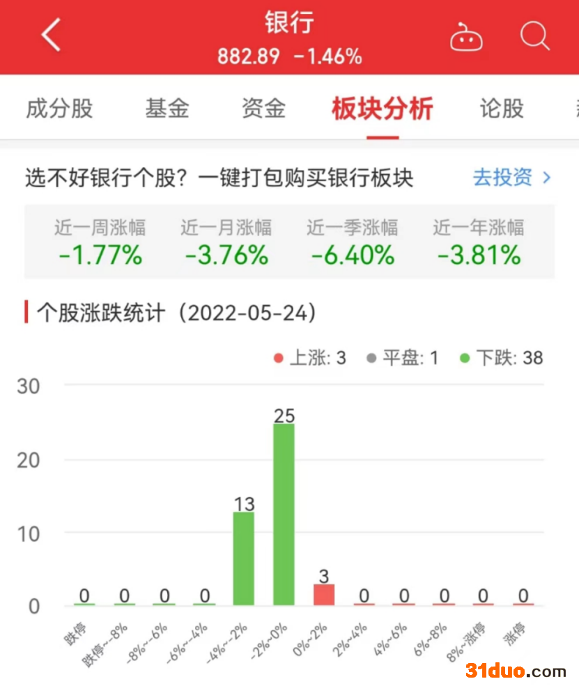 中国经济网北京5月24日讯 今日,银行板块整体跌幅1.46%,其中3只股票上涨,1只股票平盘,38只股票下跌。