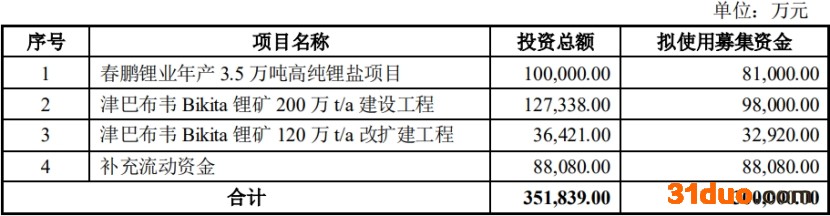 中矿资源本次非公开发行股票募集资金总额不超过30.00亿元(含本数),扣除发行费用后,募集资金净额拟投入以下项目:春鹏锂业年产3.5万吨高纯锂盐项目、津巴布韦Bikita锂矿200万t/a建设工程、津巴布韦Bikita锂矿120万t/a改扩建工程、补充流动资金。