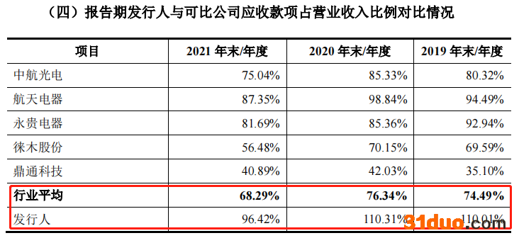 对于应收款项占营收比例高于行业均值,华达股份在首轮问询回复中表示,“公司主要客户为国有大型军工集团及下属院所,是军品厂商的整机子系统配套厂商,公司产品交付验收、得以确认收入和应收款项的阶段,处于整体产业链条的末端环节。受到最终产品交付验收和最终用户付款的进度的影响,故应收账款回收周期较长,应收款项余额较大,导致应收款项占营业收入比例较高”。