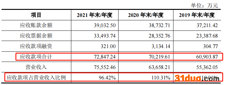 此外,华达股份应收款项合计占营业收入的比例显著高于同行业可比公司。报告期内,公司应收款项合计分别为6.09亿元、7.02亿元和7,28亿元,占营业收入的比例分别为110.01%、110.31%和96.42%。对比同行业可比公司,同行业公司应收款项占营收比例的均值分别为74.49%、76.34%和68.29%。