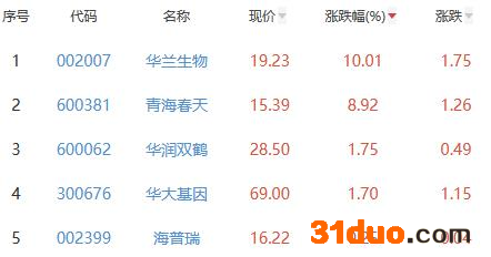 其中,华兰生物、青海春天、华润双鹤、华大基因、海普瑞位列板块涨幅前五位,涨幅分别为10.01%、8.92%、1.75%、1.70%、0.25%。