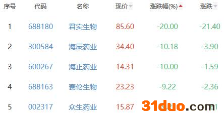 君实生物、海辰药业、海正药业、赛伦生物、众生药业位列涨幅榜后五位,涨幅分别为-20.00%、-10.18%、-10.00%、-9.22%、-9.21%。