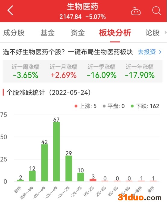 中国经济网北京5月24日讯 今日,生物医药板块整体涨幅-5.07%,其中5只股票上涨,0只股票平盘,162只股票下跌。