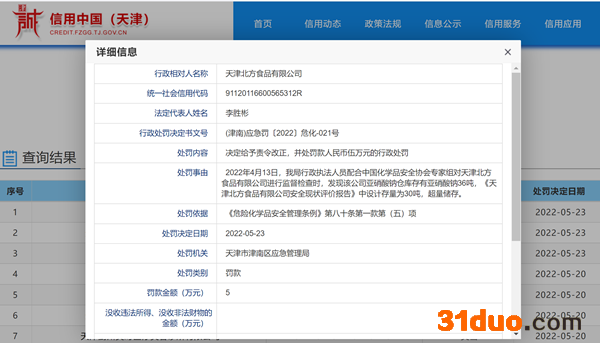 中国网财经5月24日讯(记者钟文鑫) 据信用中国(天津)网站消息,近日,天津北方食品有限公司因超量储存亚硝酸钠,被天津市津南区应急管理局处以罚款5万元。