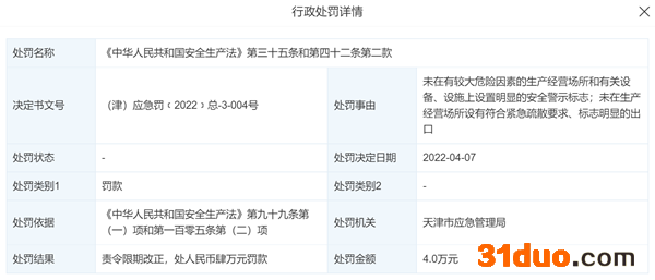 中国网财经梳理发现,今年4月,天津北方食品有限公司因存在未在有较大危险因素的生产经营场所和有关设备、设施上设置明显的安全警示标志等行为,被天津市应急管理局罚款4万元。