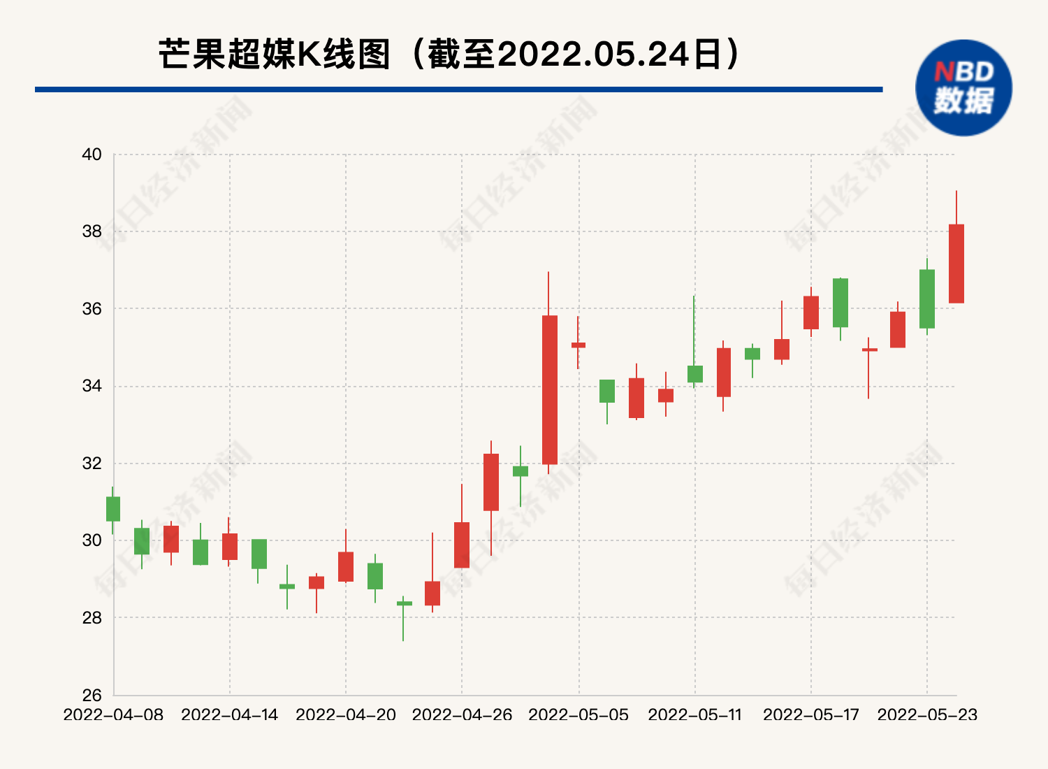 但在5月24日开盘后,形势发生了大转变,芒果超媒一度涨幅扩大至10%,截至发稿,芒果超媒涨7.04%,报38元/股,总市值为714.8亿元。