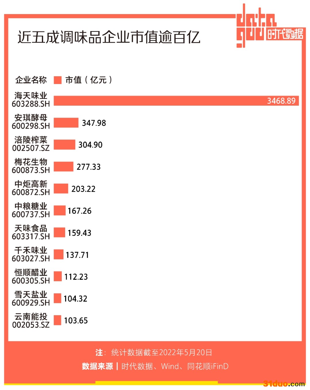 据时代数据统计,截至2022年5月20日,一共有11家公司市值超过100亿元,占比达到45.83%。其中,海天味业(603288)市值高达3468.89亿元,雄踞第一;安琪酵母(600298)市值347.98亿元,位居第二;涪陵榨菜(002507)市值304.9亿元,位居第三。