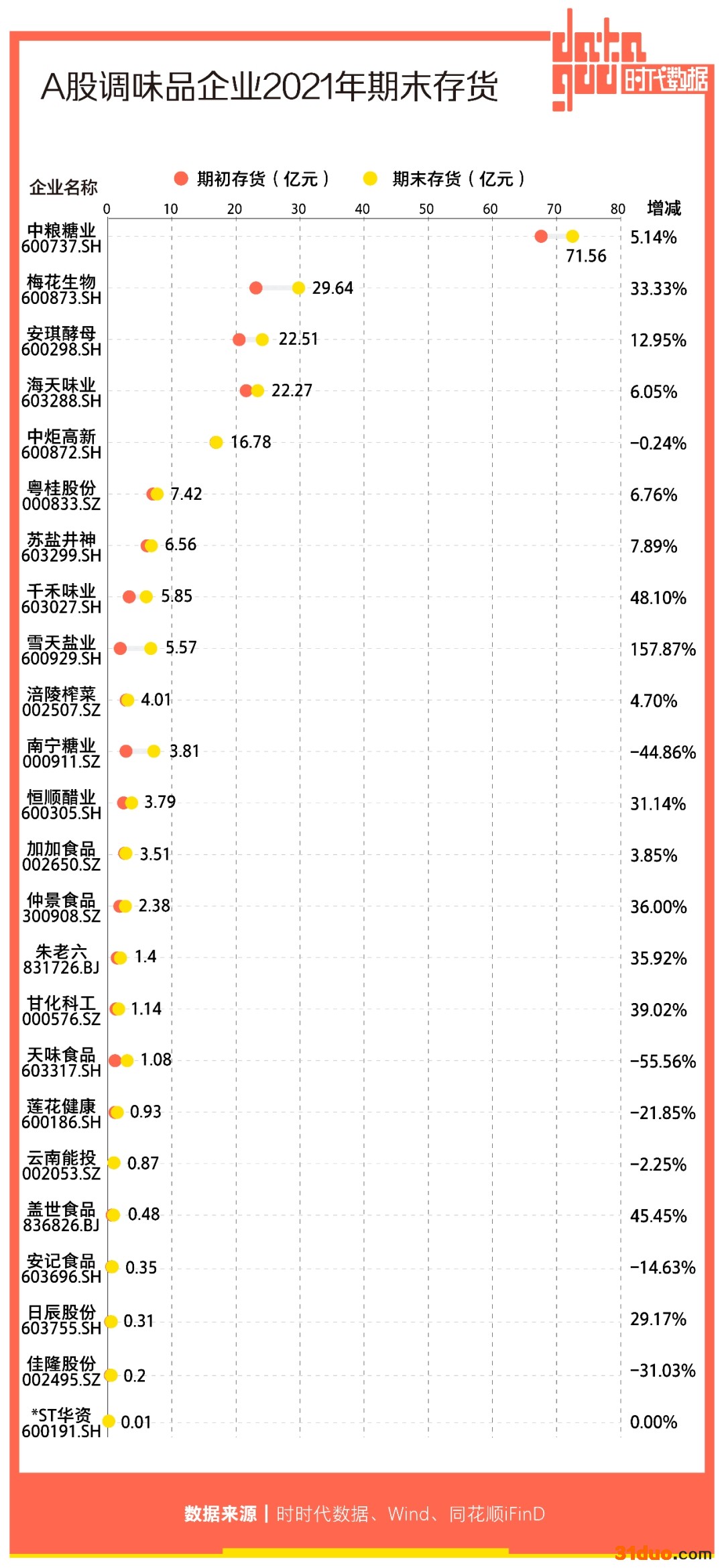 此外,中粮糖业(600737)的期末存货最大,达到71.56亿元;其后,梅花生物(600873)、安琪酵母(600298)、海天味业(603288)的期末存货均超过20亿元,分别为29.64亿元、22.51亿元、22.27亿元。