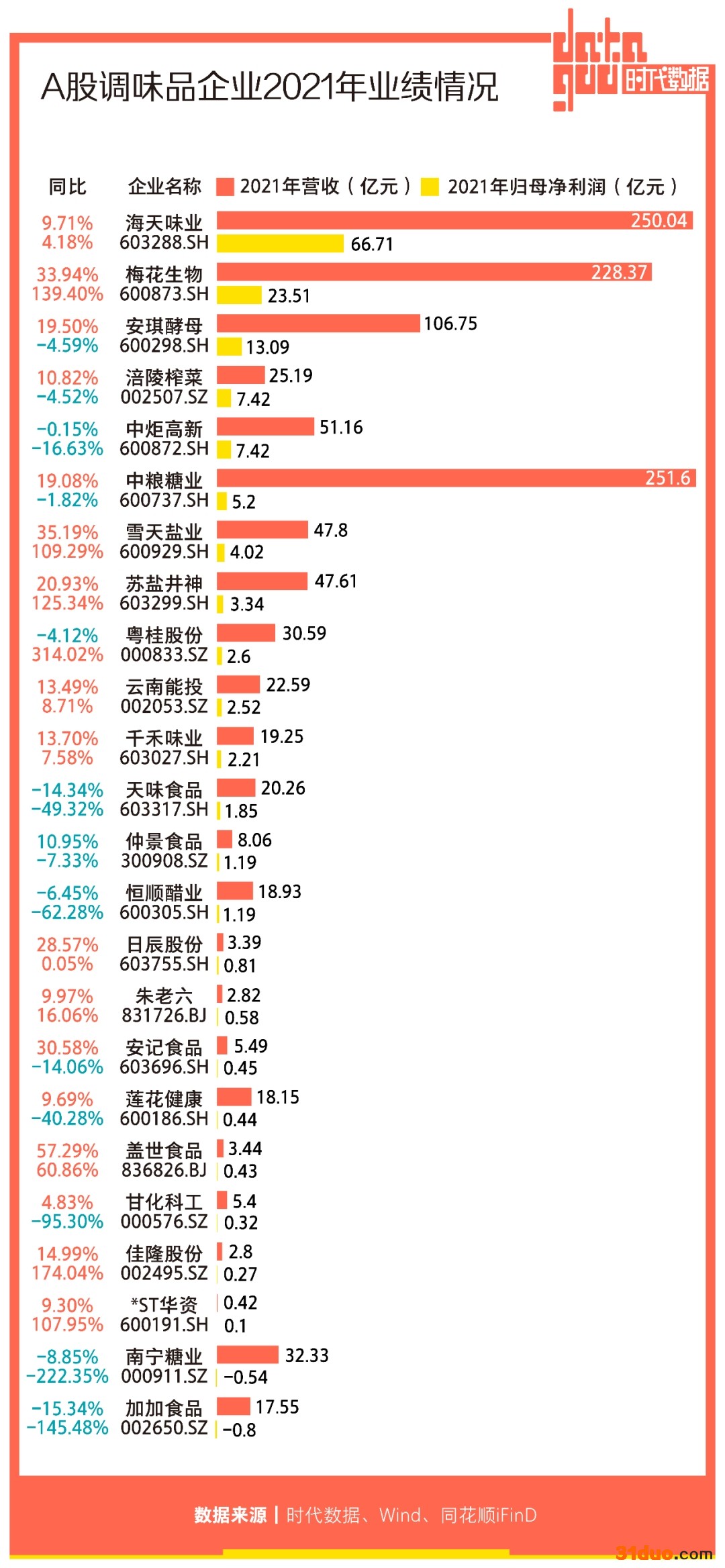 另一边,海天味业(603288)2021年业绩则遥遥领先,归母净利润高达66.71亿元,同比增长4.18%,继续蝉联“盈利王”。