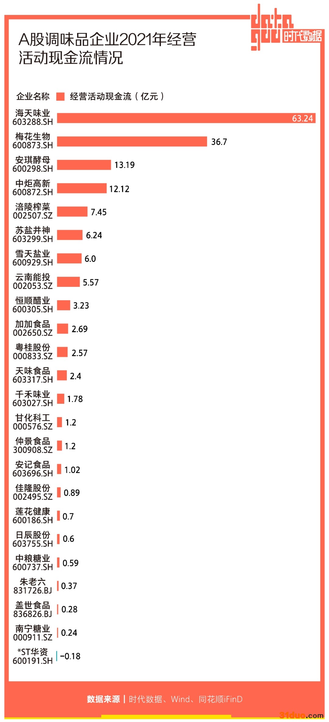 当费用占比居高不下,公司现金流难免不受影响。据时代数据统计,截至2021年期末,有1家调味品企业经营活动现金流为负,*ST华资(600191)经营活动现金流为-0.18亿元,已经连续5年为负值。另一方面,海天味业(603288)经营活动现金流高居第一,为63.24亿元。