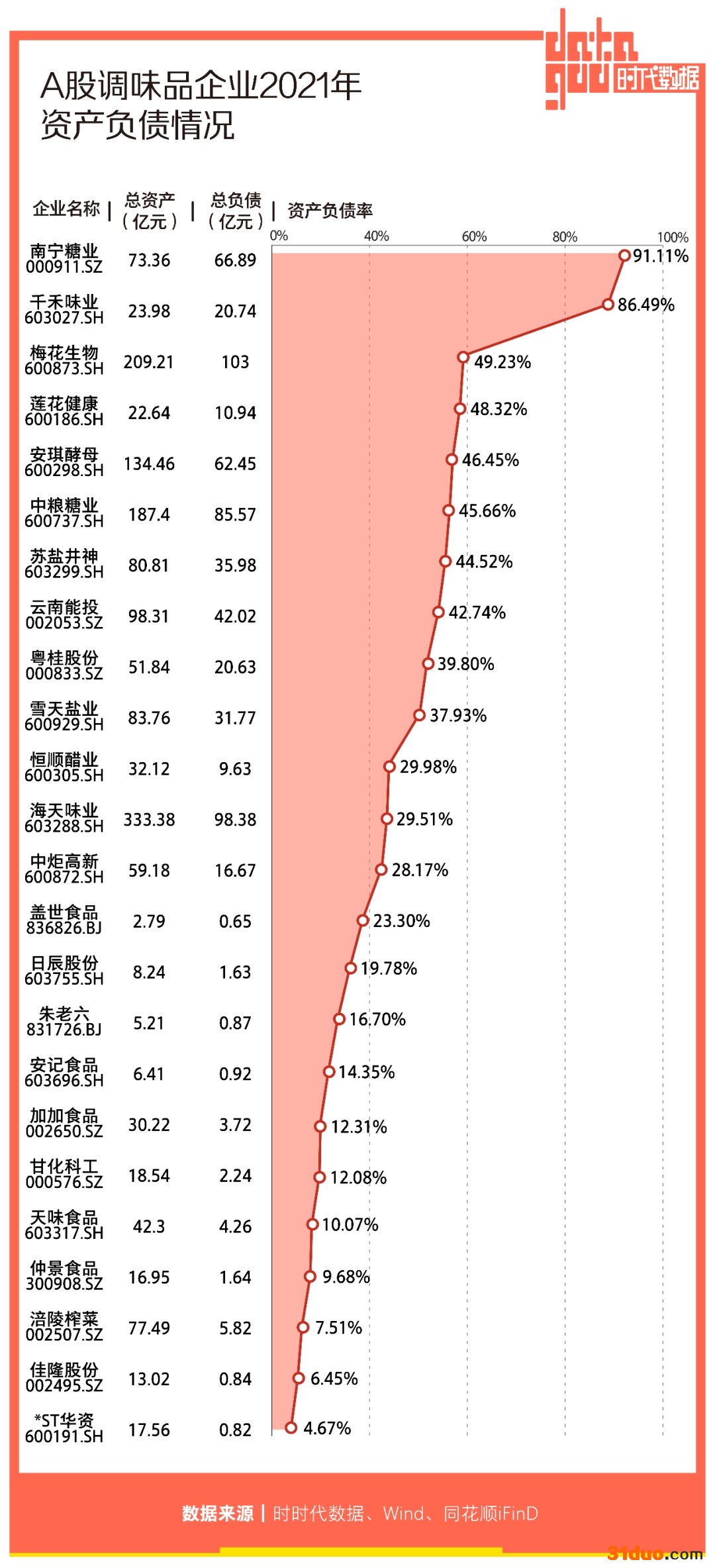 据时代数据统计,A股调味品企业平均负债率为31.54%,负债率超过平均负债率的公司有10家。其中,南宁糖业(000911)资产负债率高达91.11%;紧随其后的是千禾味业(603027),资产负债率达到86.49%。此外,梅花生物(600873)的资产负债率接近50%,为49.23%。