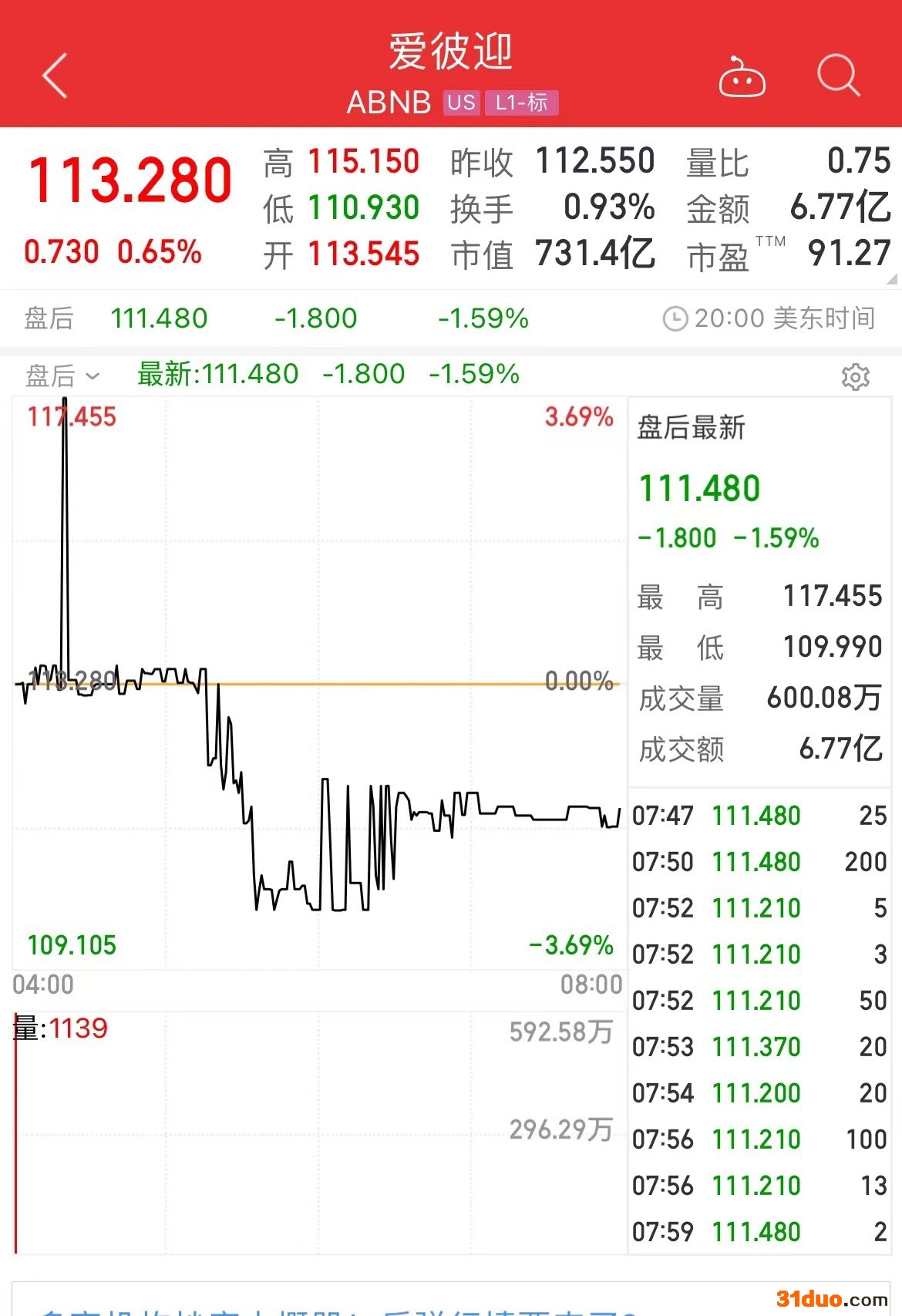 截至发稿前,爱彼迎盘后股价跌1.59%,股价111.48美元。