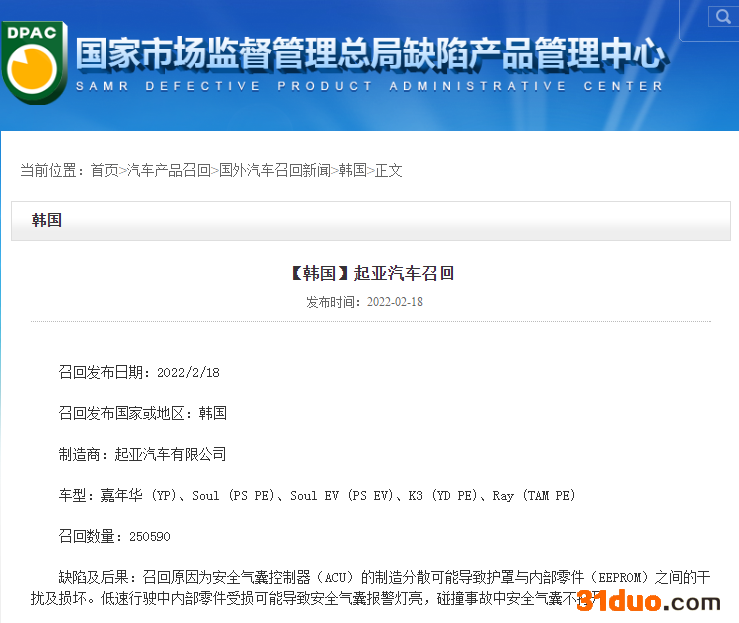 值得注意的是,记者从监管总局查询到,起亚汽车曾于今年2月份,因安全气囊问题在韩国召回包括嘉年华、Soul、K3等车型在内的故障车辆,数量高达25万余辆,具体召回原因为“安全气囊控制器(ACU)的制造分散可能导致护罩与内部零件(EEPROM)之间的干扰及损坏。低速行驶中内部零件受损可能导致安全气囊报警灯亮,碰撞事故中安全气囊不打开。”