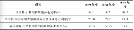 记者还注意到,与同行企业比较,2017年至2019年,贝瑞基因的基础科研服务毛利率水平也呈现出相反的变化趋势。
