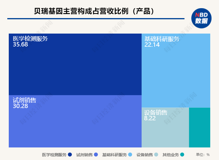 贝瑞基因主营业务为以高通量测序技术为基础的基因检测服务和设备、试剂销售。以无创产前基因检测(NIPT)为主的医学检测服务是公司主要收入来源。